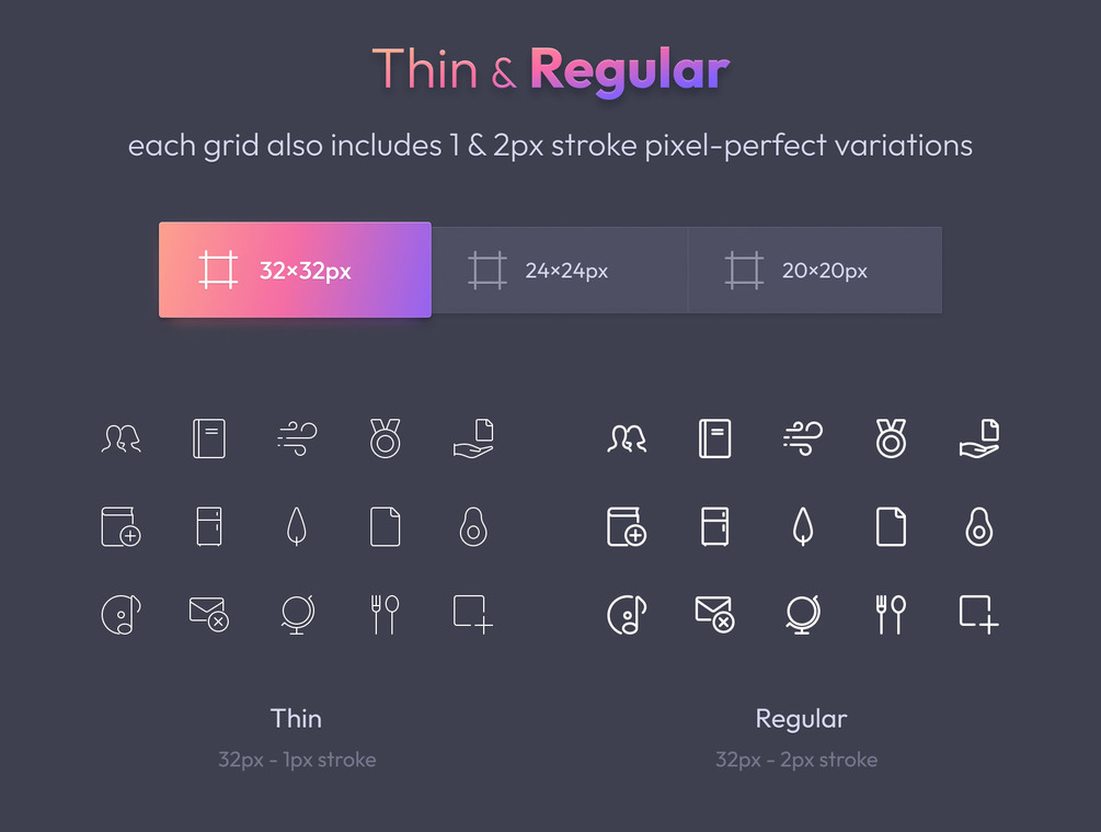 Pixelins Thin Icons is a high-quality icon set with 1236 icons carefully crafted on 20-24-32px grid sizes, including hand-optimized 1 & 2px stroke variations for each grid (in total 7416 pixel perfect icons). Ideal solution for professional dashboards, web sites, apps, user interfaces, prints and more.